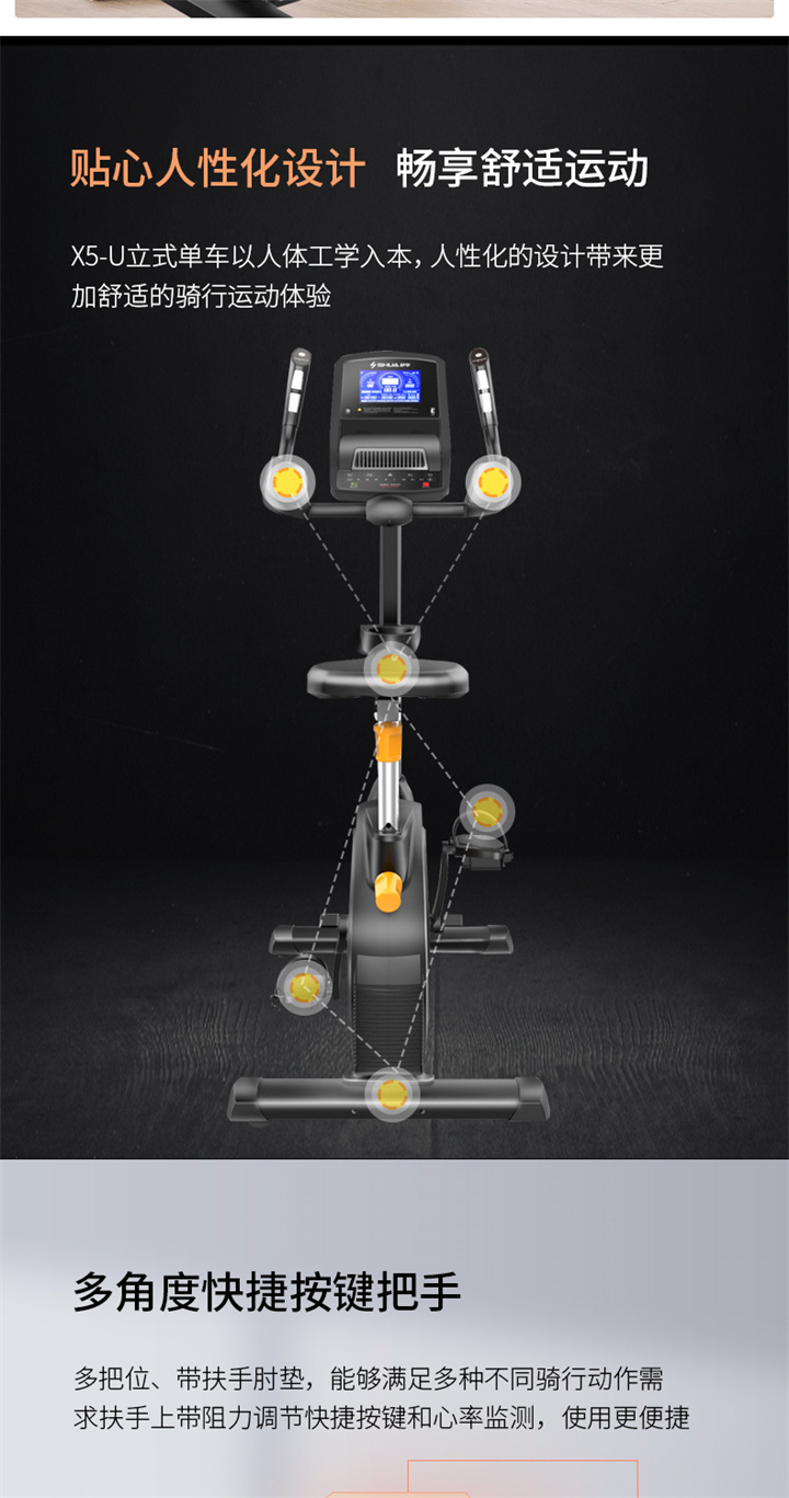 舒华立式健身车SH-6500U(X5-U)采用自发电,曲轴达3PCS,电控的阻力系统,设有24段阻力等级,拥有7.5kg的磁控轮。